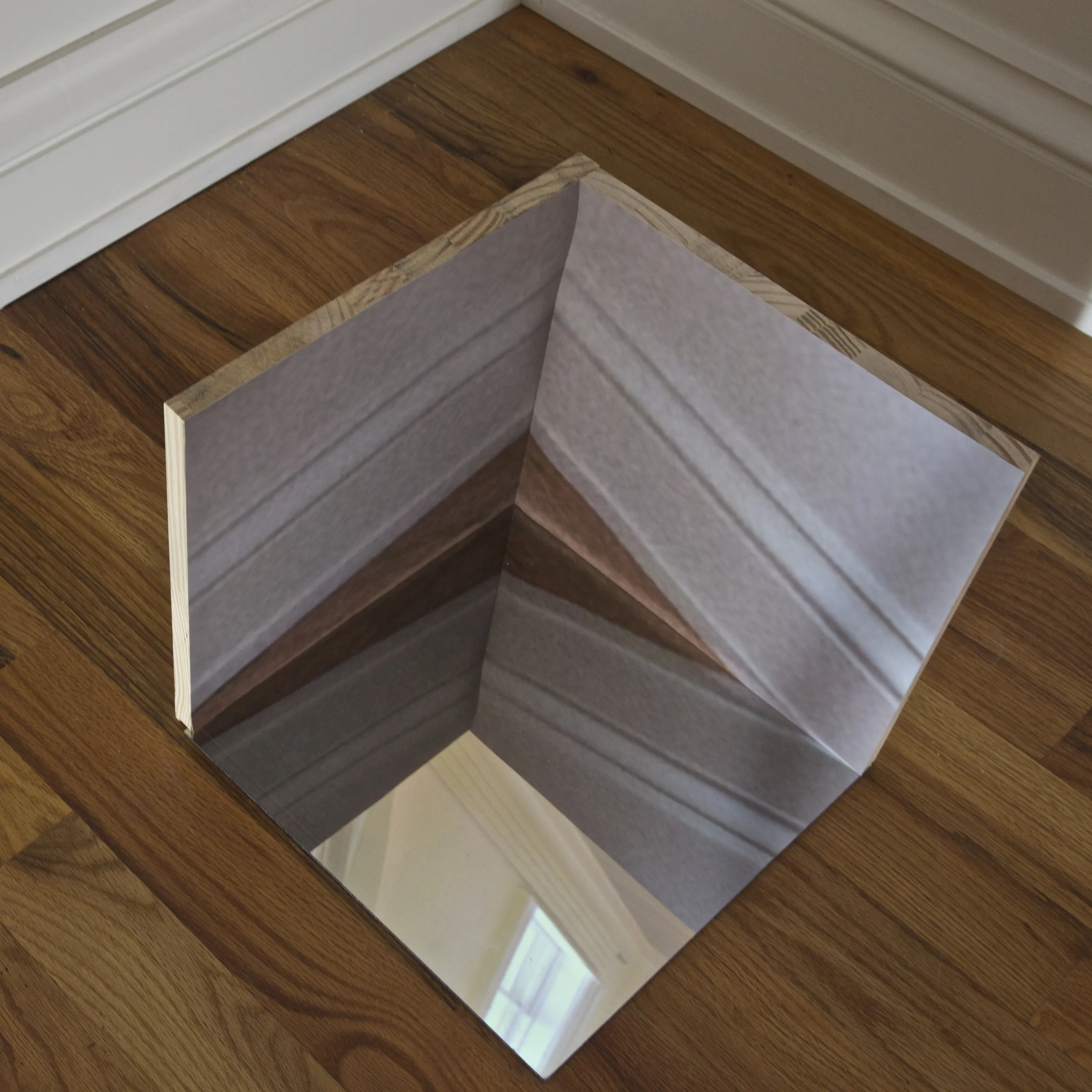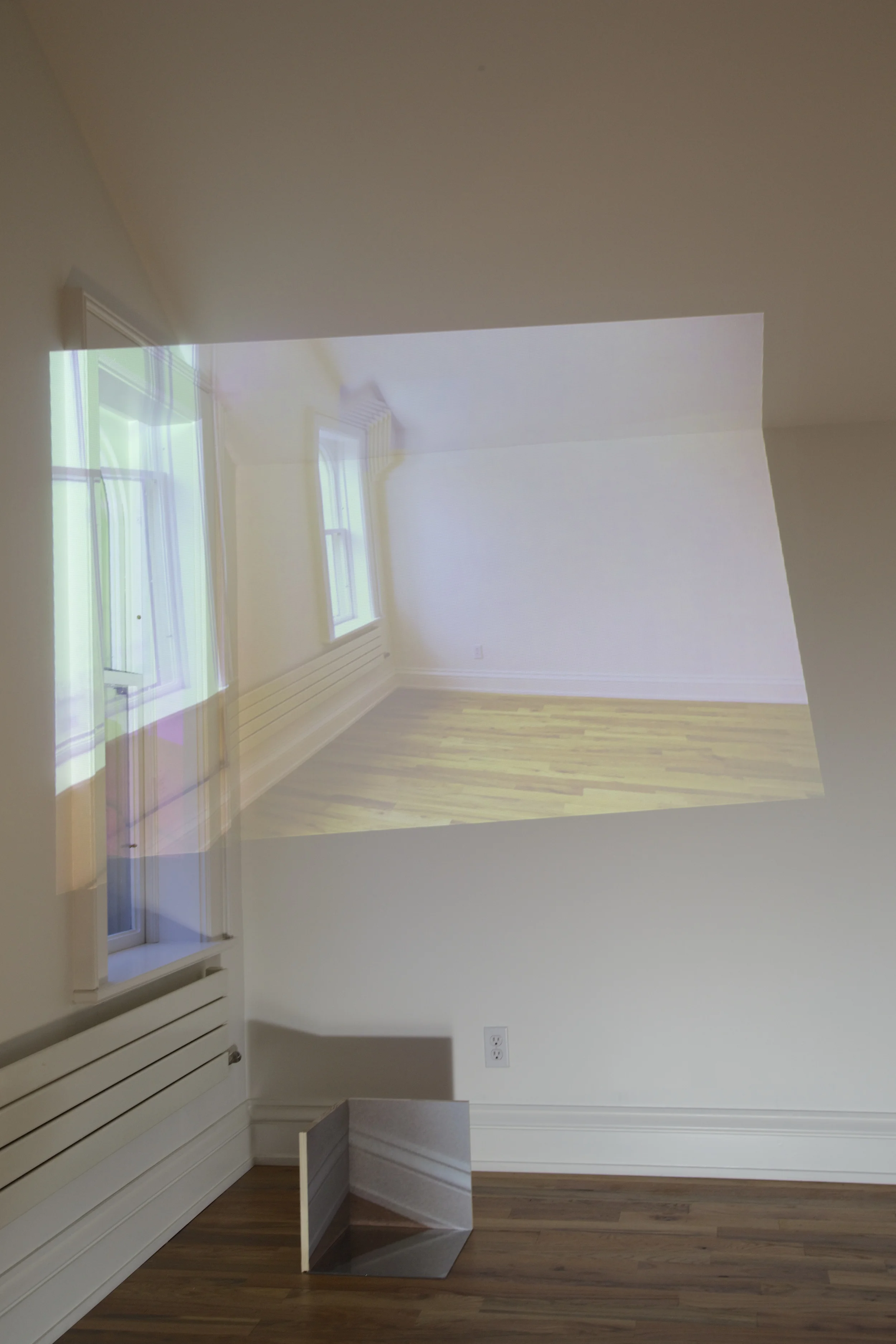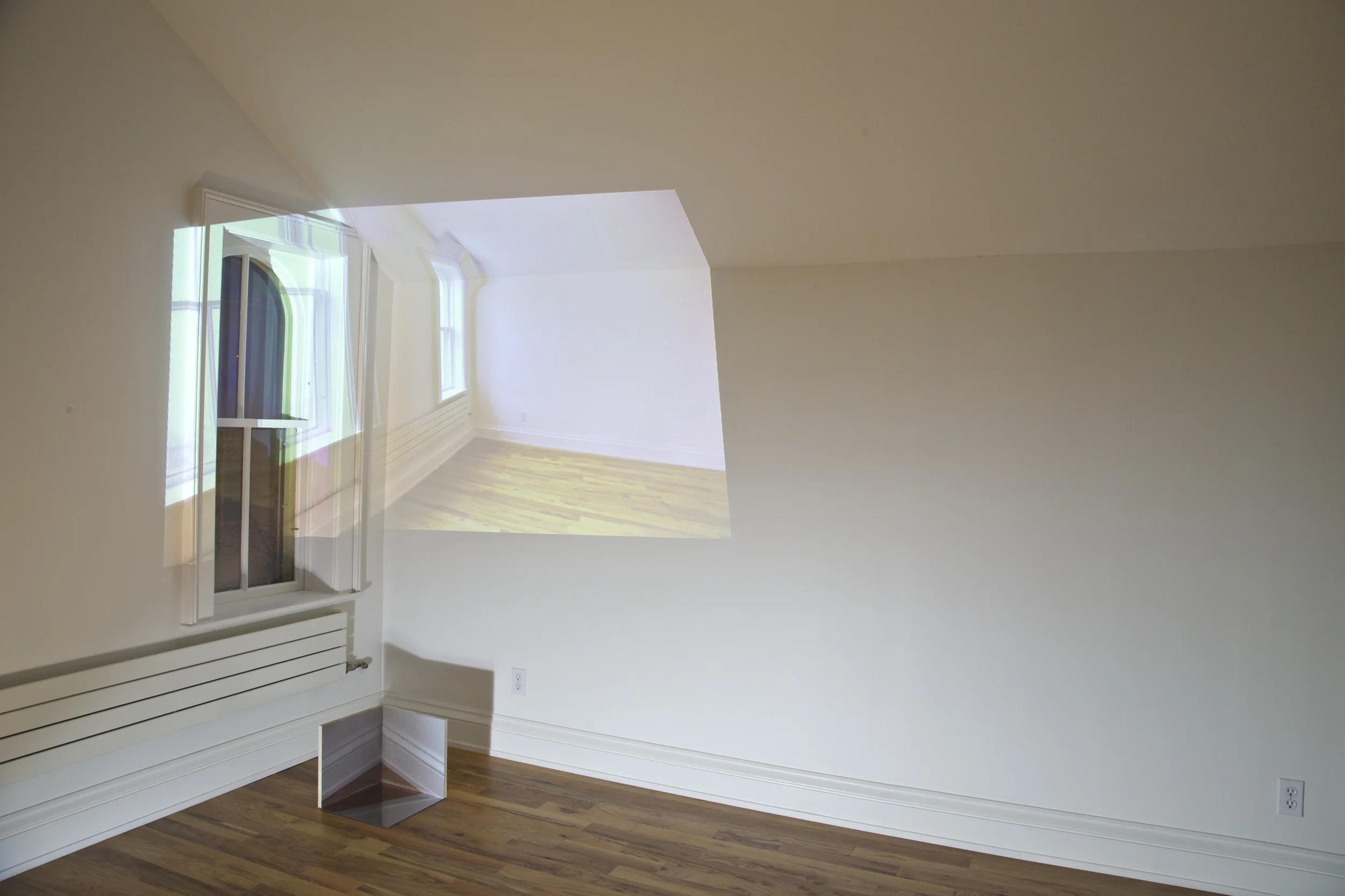 Projection with sculpture: wood, mirrored plexi, archival photo print.