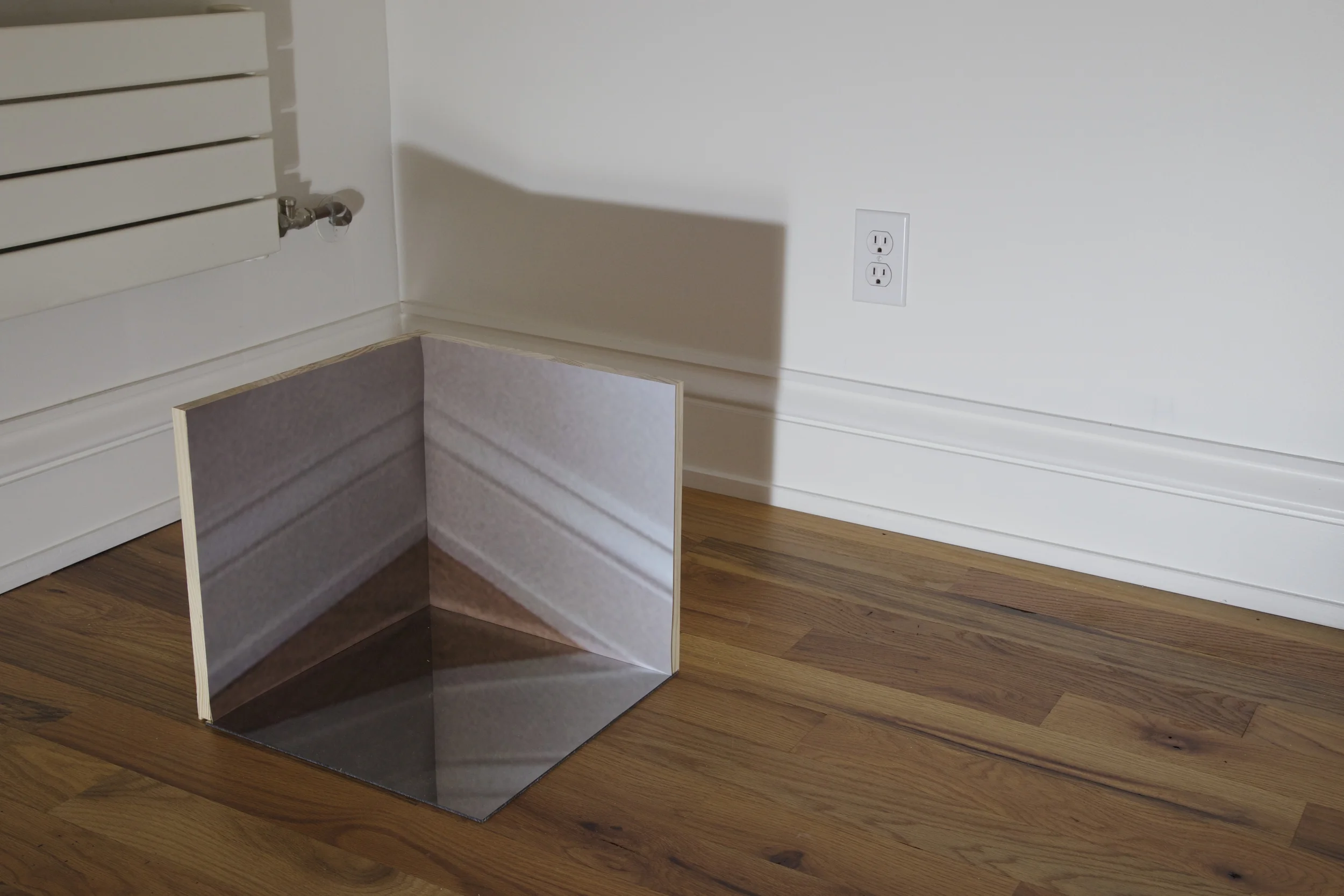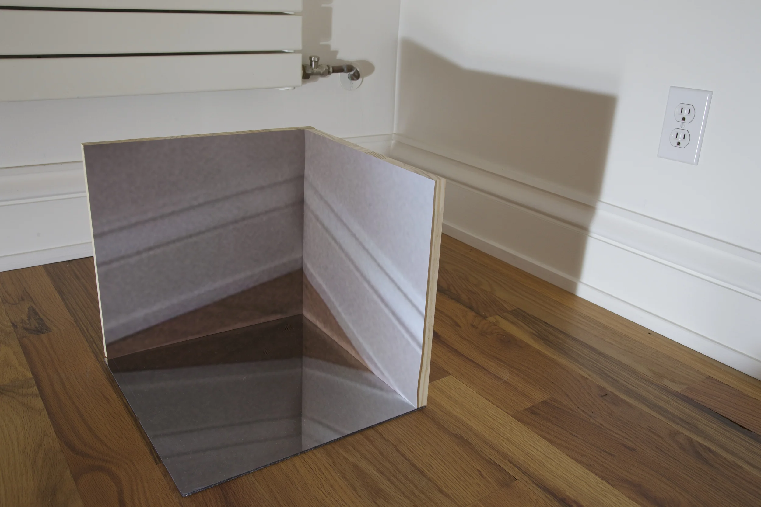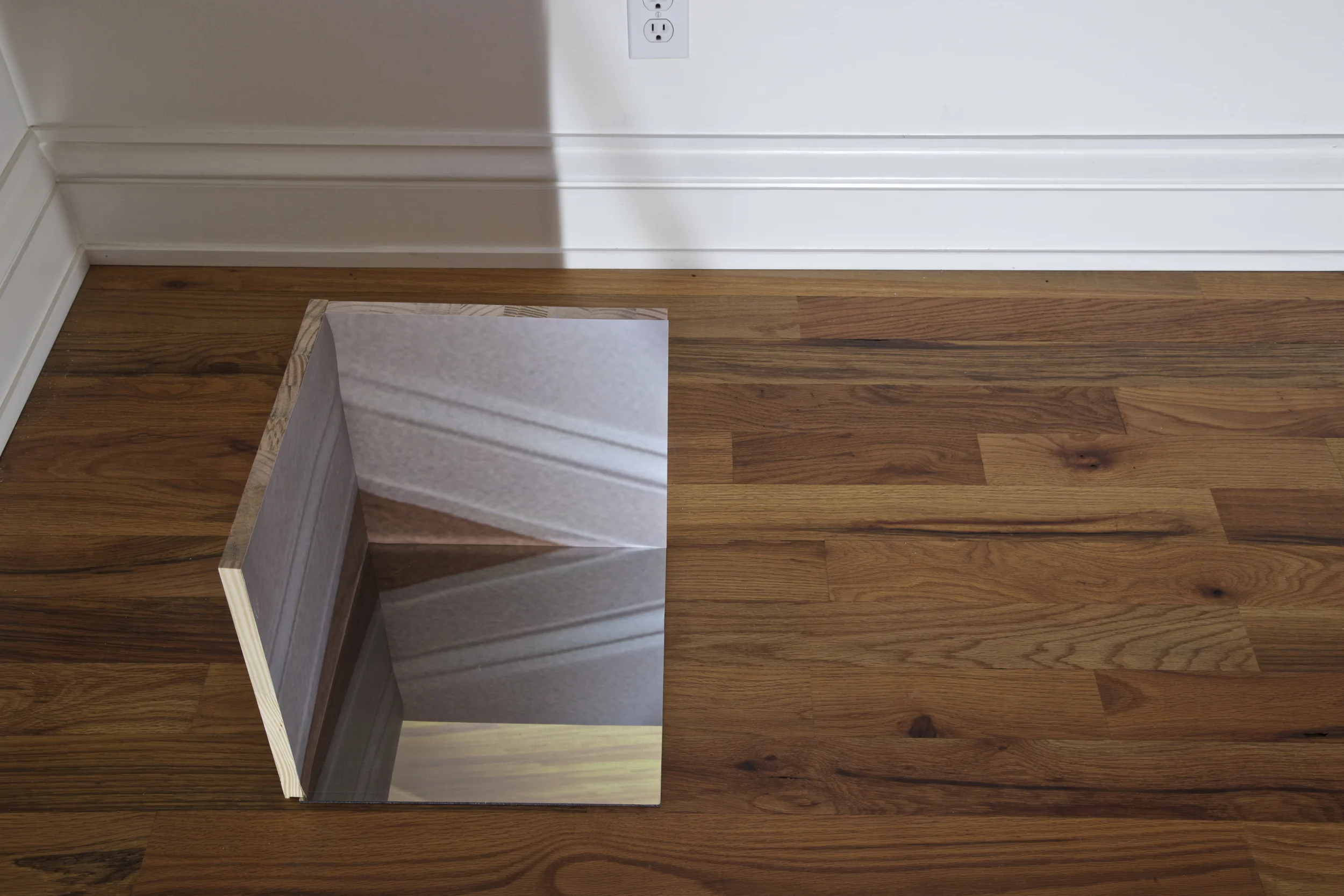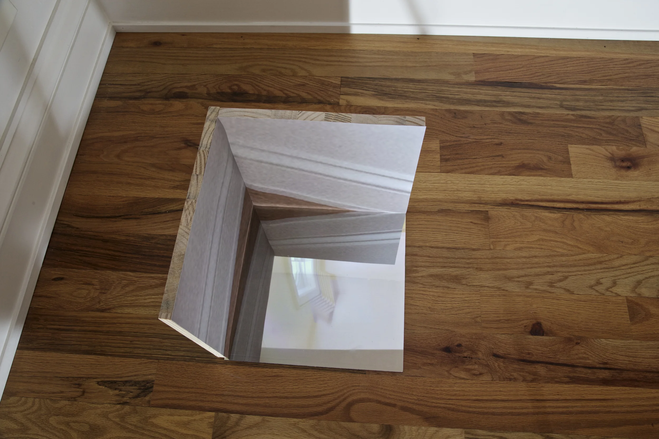 Projection with sculpture: wood, mirrored plexi, archival photo print.