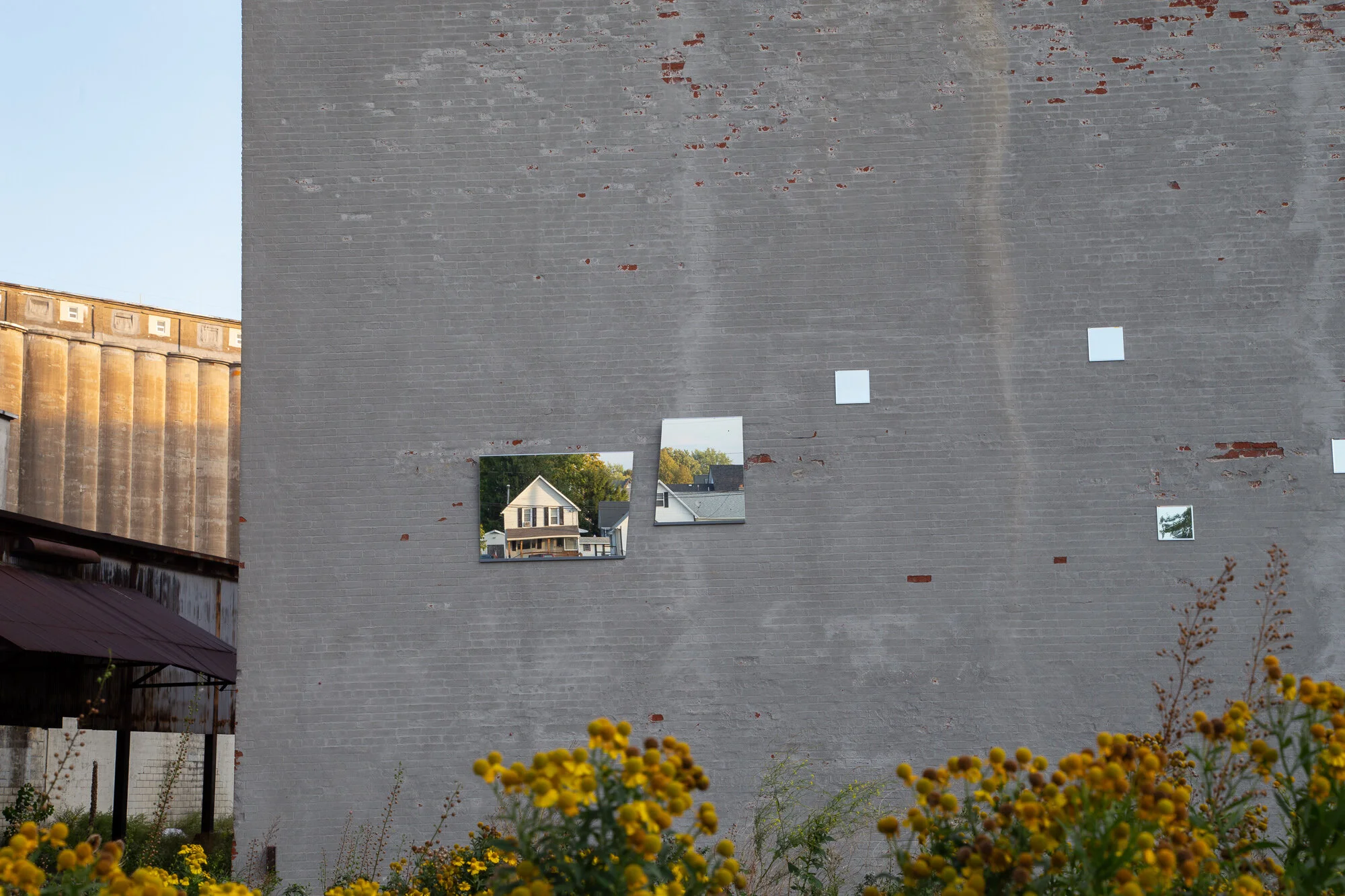 Together, the mirrors and the buildings form an ever-changing collage of a place and time; exactly here, but exactly not. Eventually even the mirrors themselves will change as the silver particles behind the glass begin to cloud and antique from the elements. As the rectangular boundaries dissolve, the images in the reflection will recede back into the texture of the buildings
