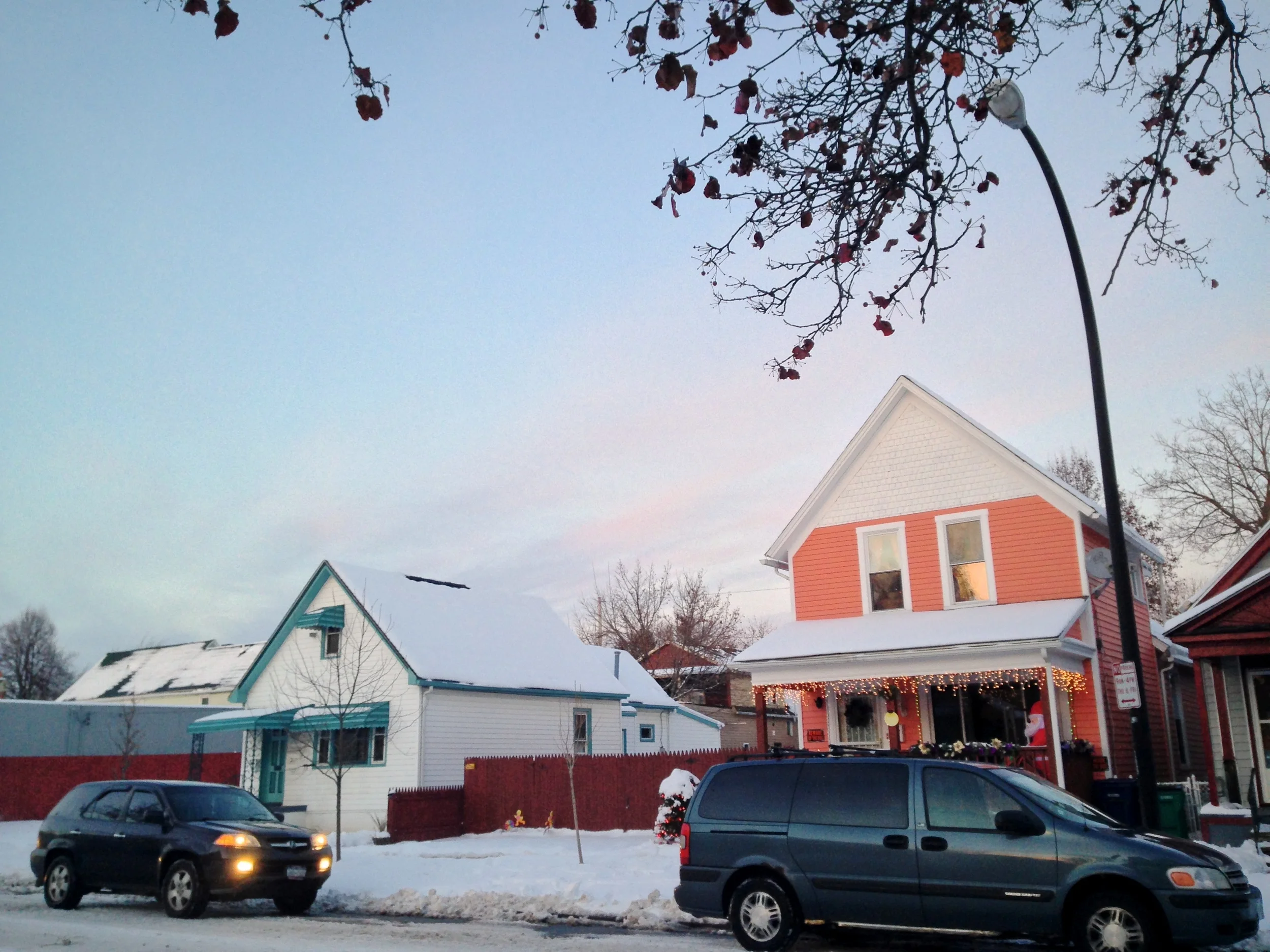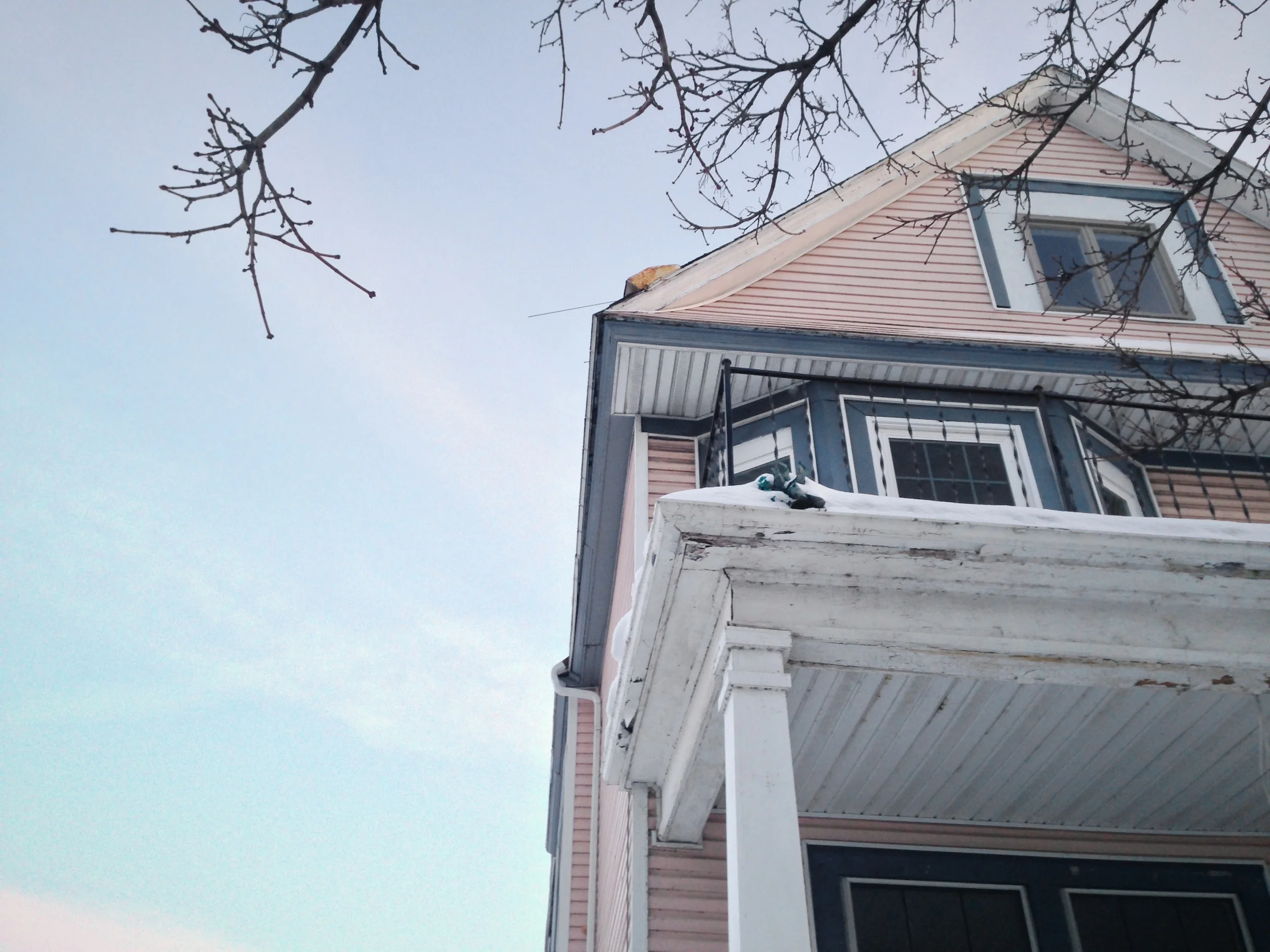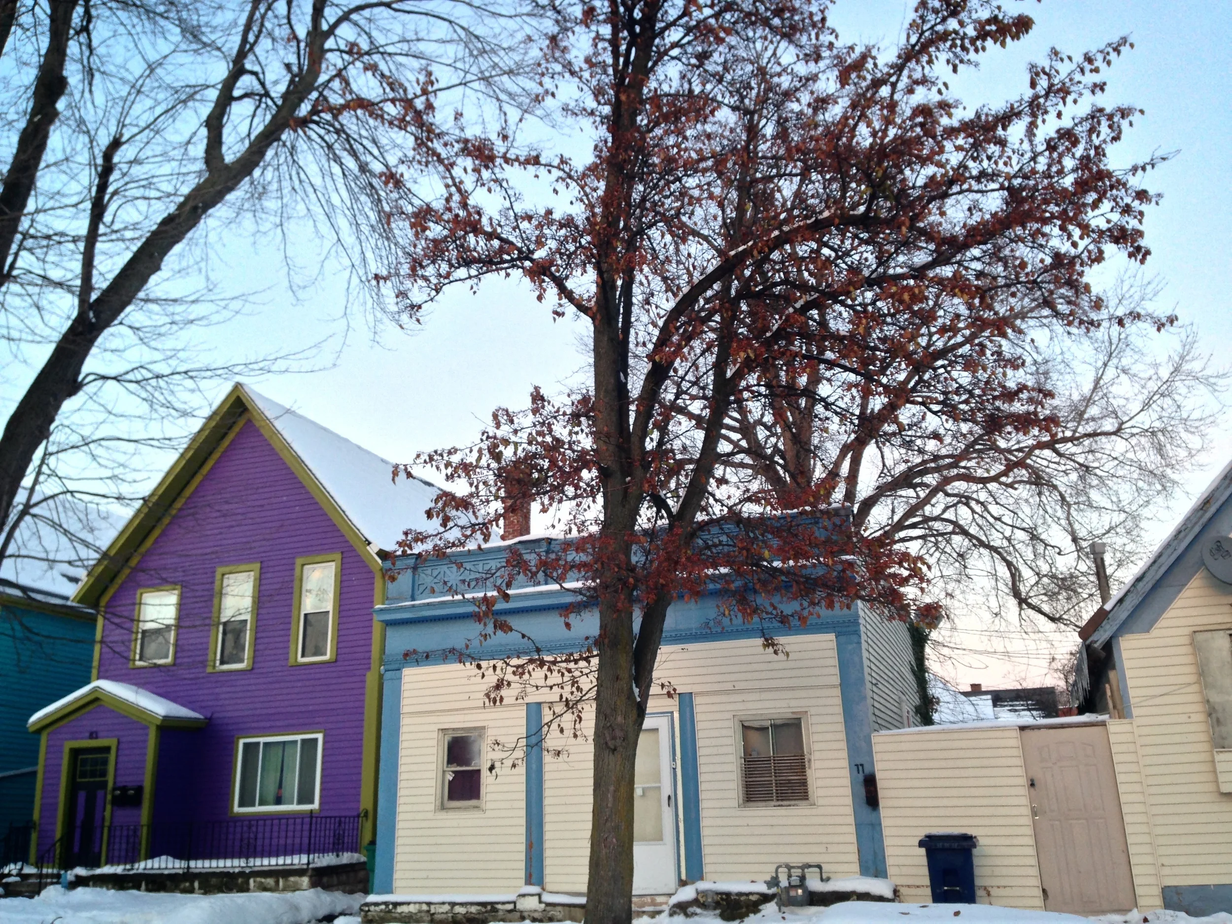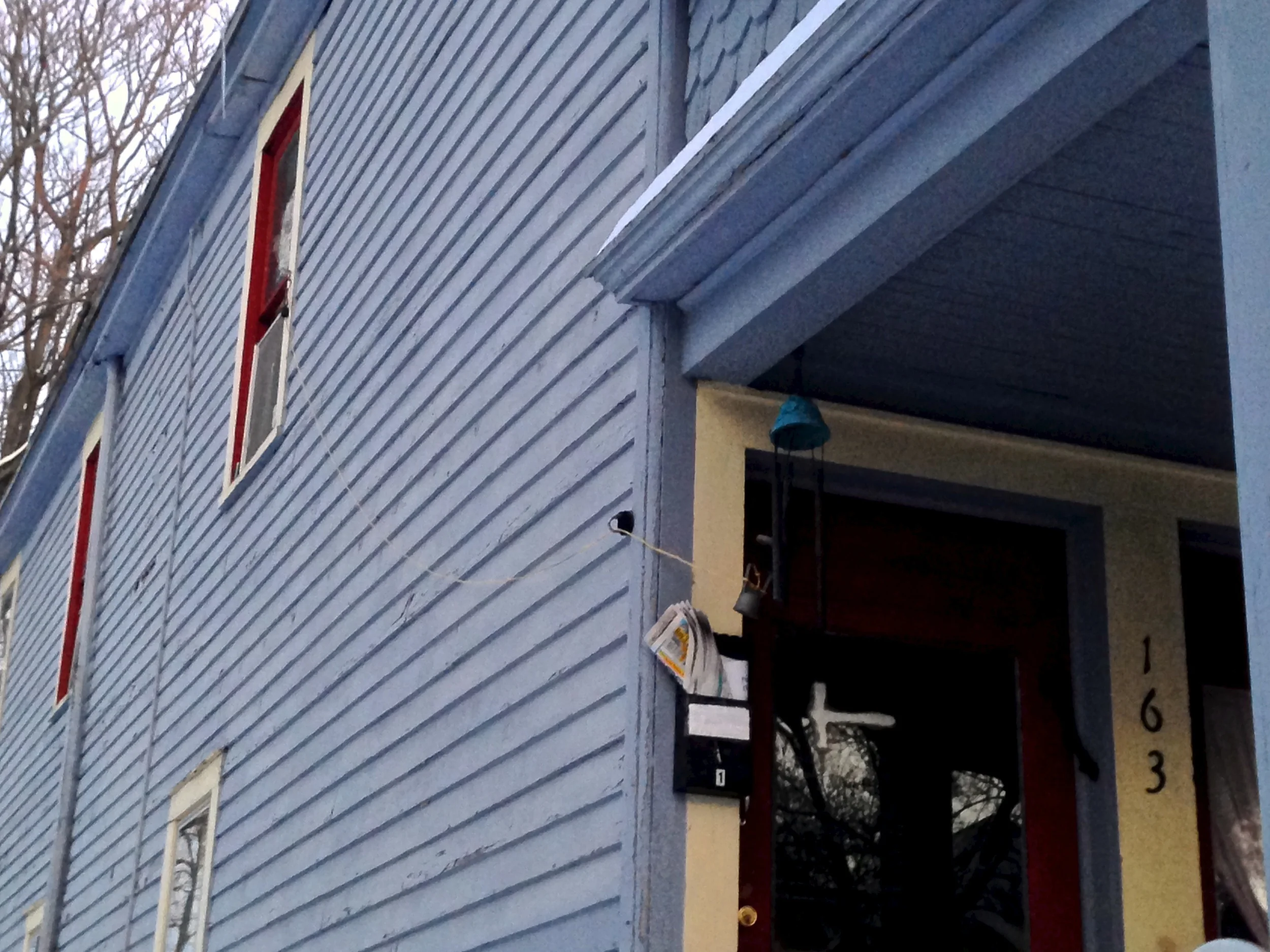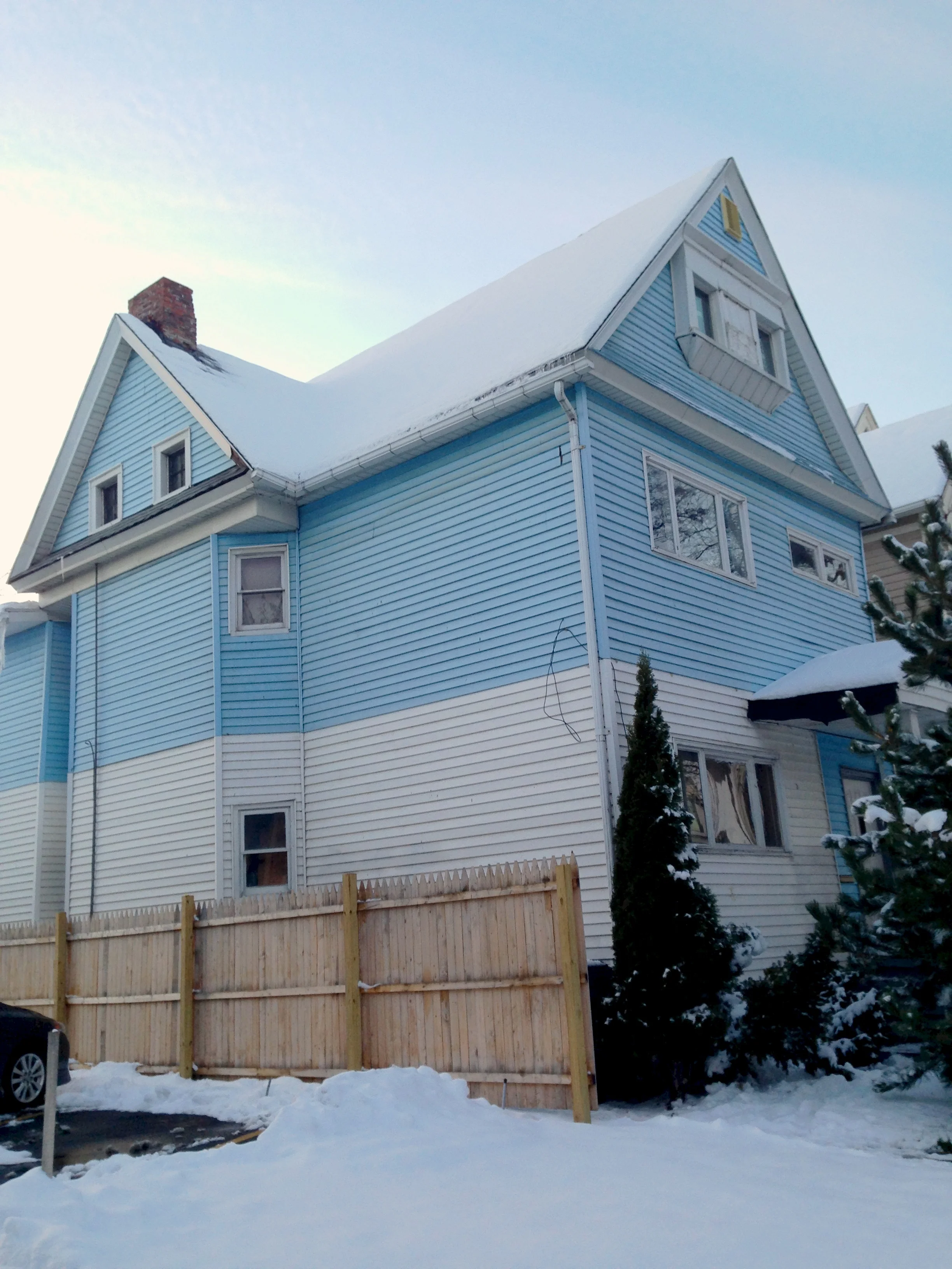 Ahead, the blue one, with the tall attic window...