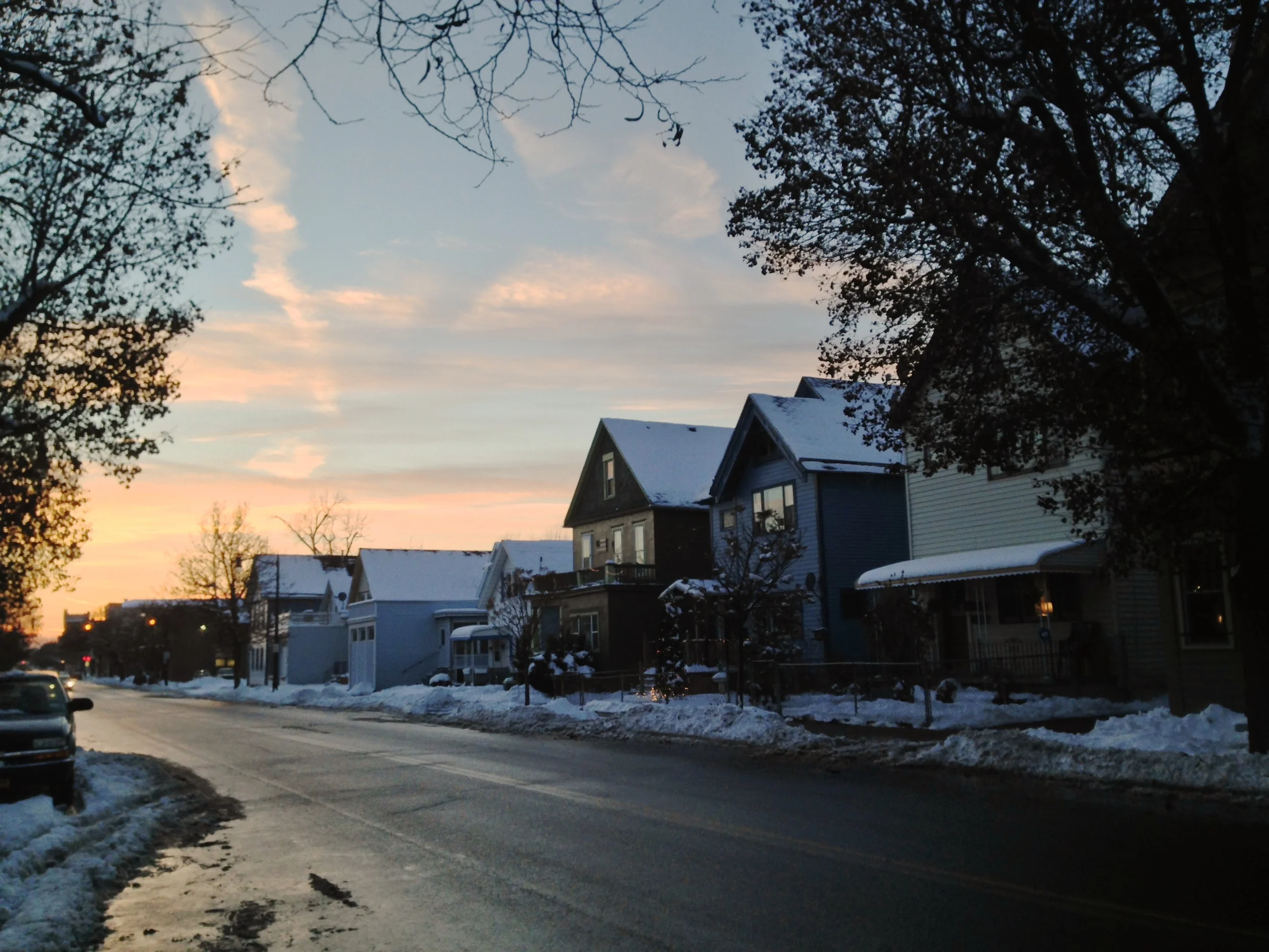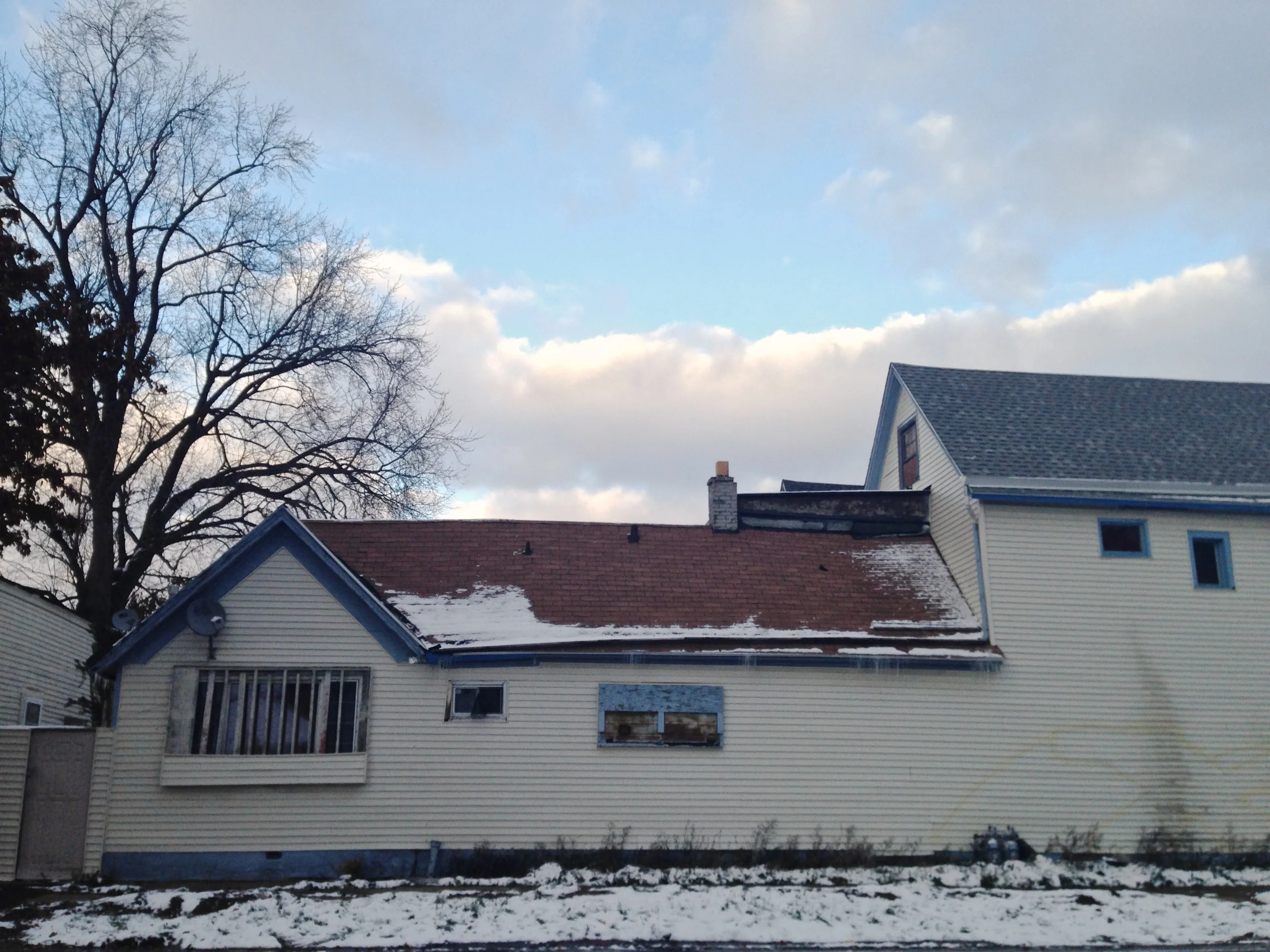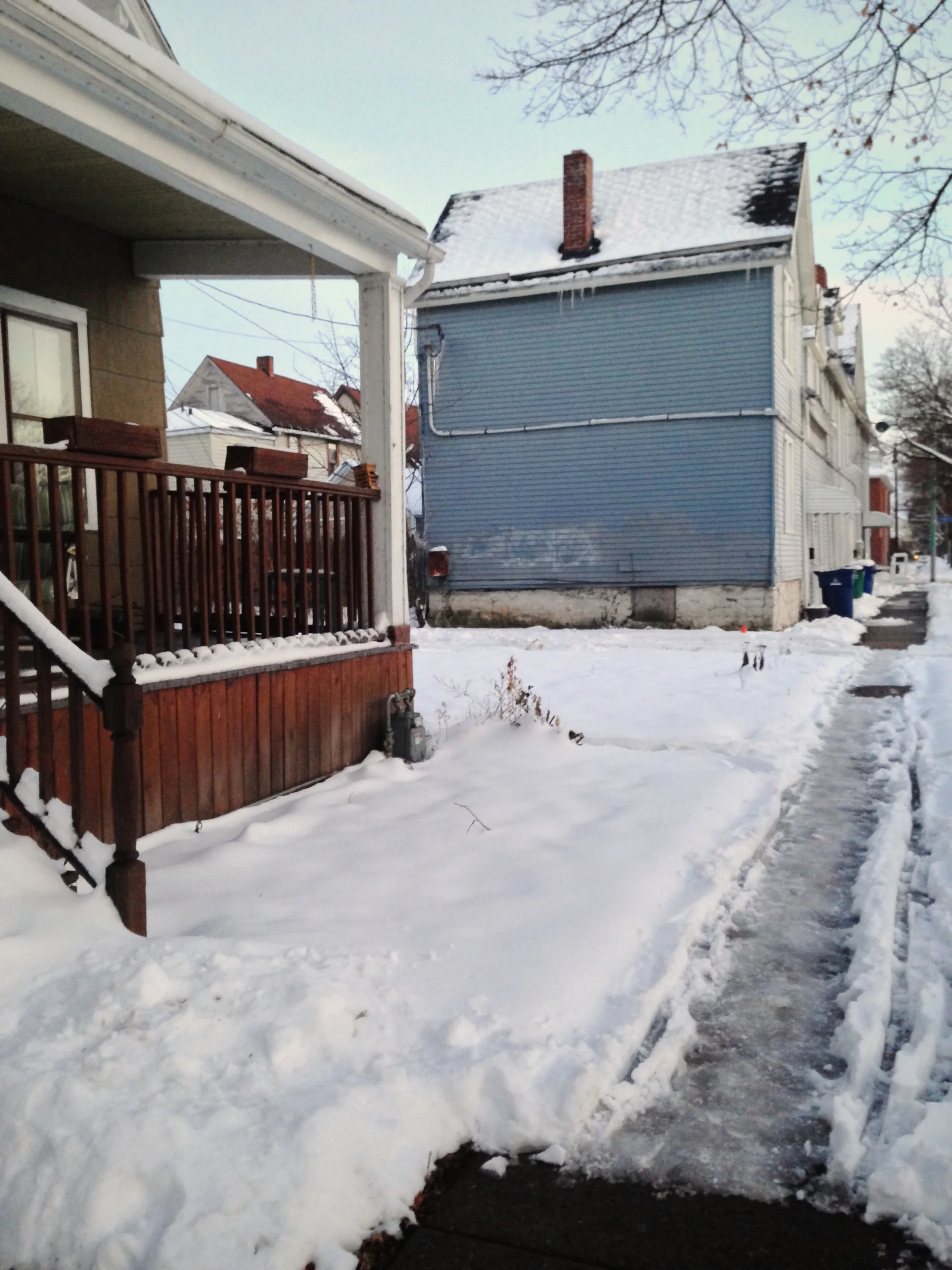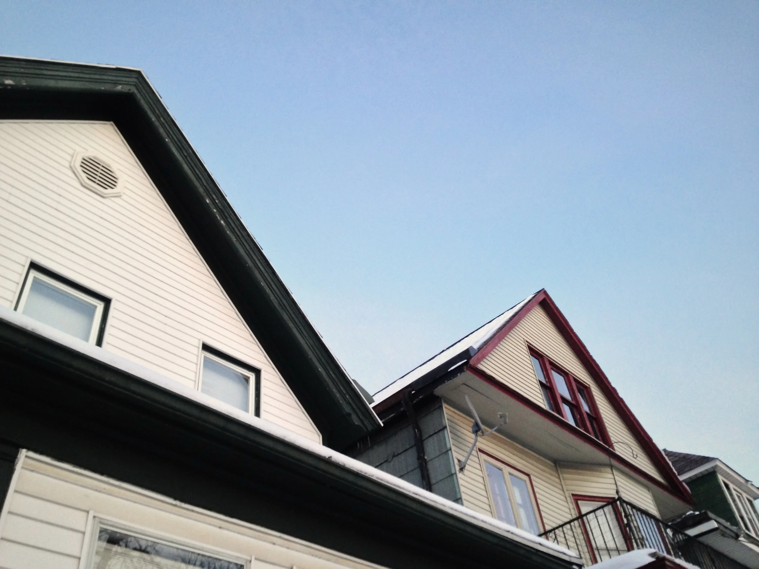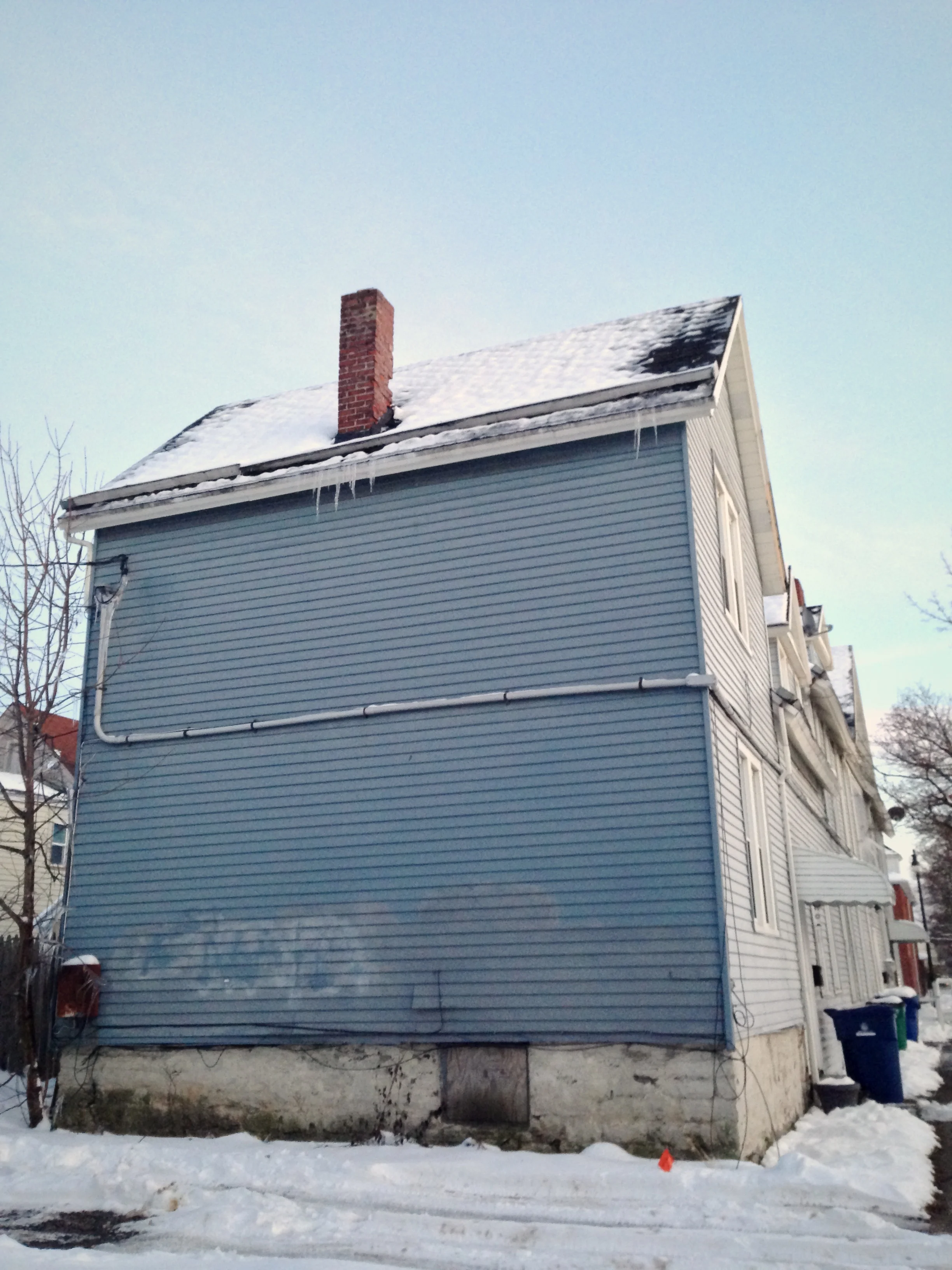Ahead, the blue one, with the tall attic window...